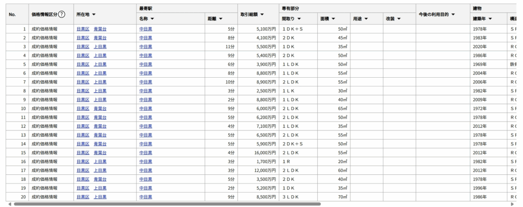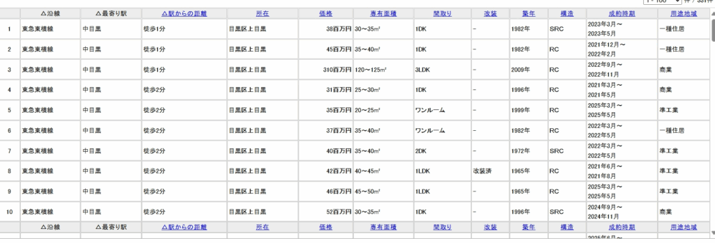 | 地域 | 成約価格 | ㎡単価 | 面積 | 築年数 |