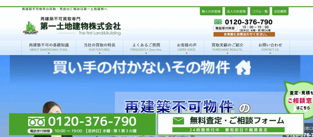 | 第一土地建物株式会社 | 東京都23区中心の専門特化 再建築不可/既存不適格の調査から提案 24時間受付フォームで相談可 自社一貫で査定〜買取まで対応 狭小・私道など“訳あり”案件にも対応 |