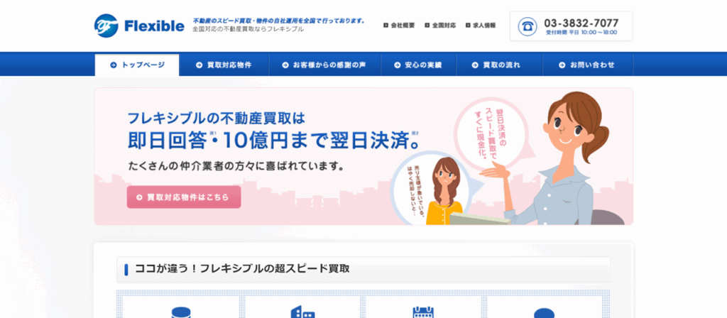 | 株式会社フレキシブル | 即日回答・翌日決済に対応 東京を拠点に全国買取 再建築不可・瑕疵あり物件も査定可 短期決済の実績(数日で完了) スピード重視の体制 |