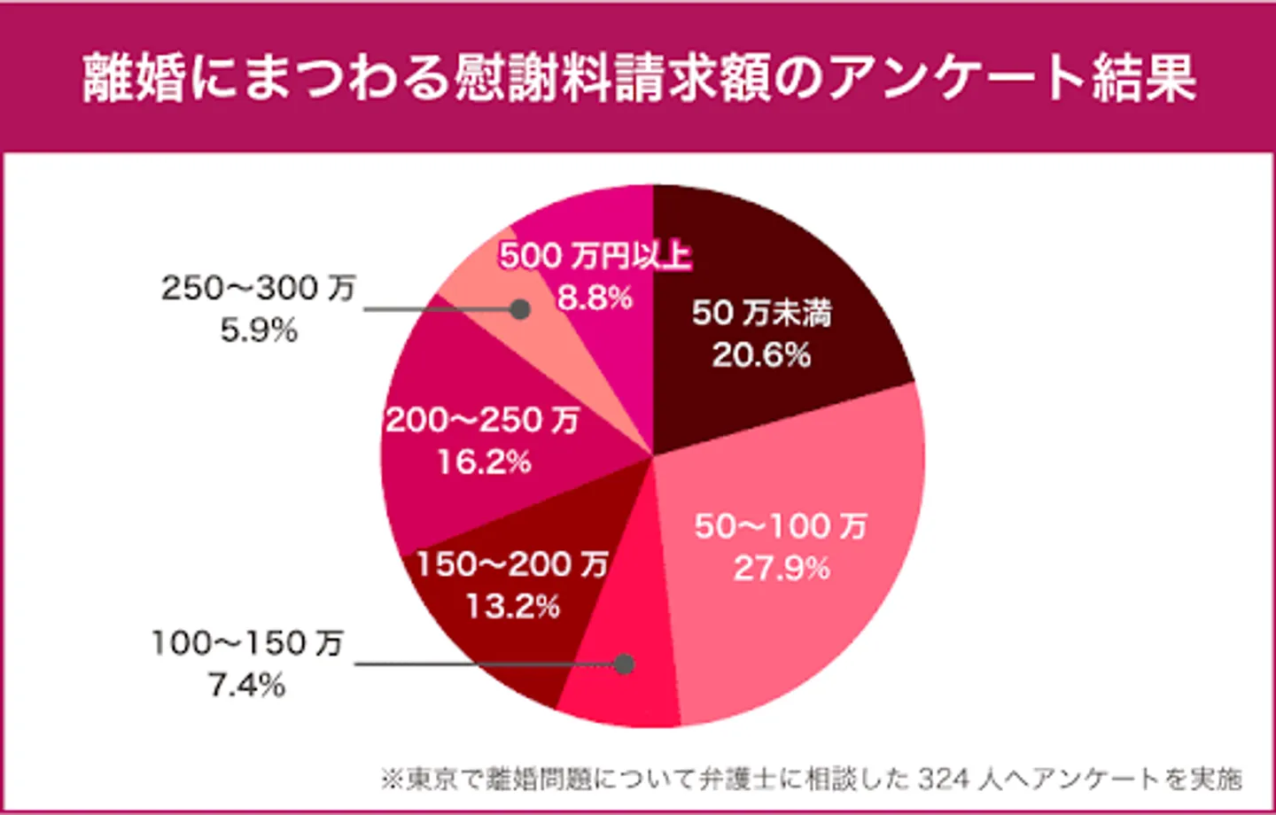 不倫慰謝料の相場は、離婚に至ったか否かなどさまざまな条件で変わります。当社が行ったアンケートを実施したところ、離婚にまつわる慰謝料請求額は300万円までが全体の約9割との結果でした。