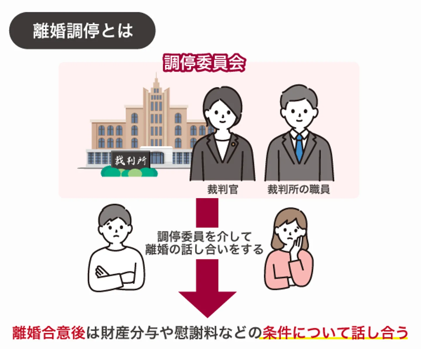 離婚調停とは、家庭裁判所の調停委員を仲介者として離婚の話し合いを進める手続きです。