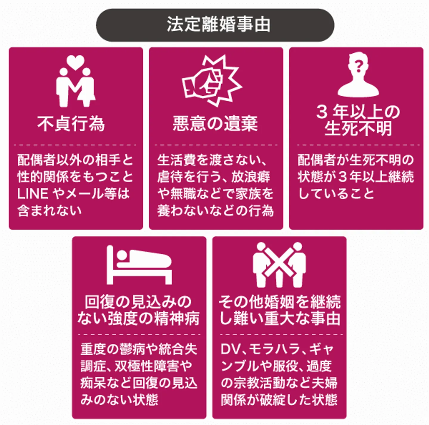 法定離婚事由とは、法律で定められた離婚の理由のことで、以下の5つが該当します(民法770条1項)