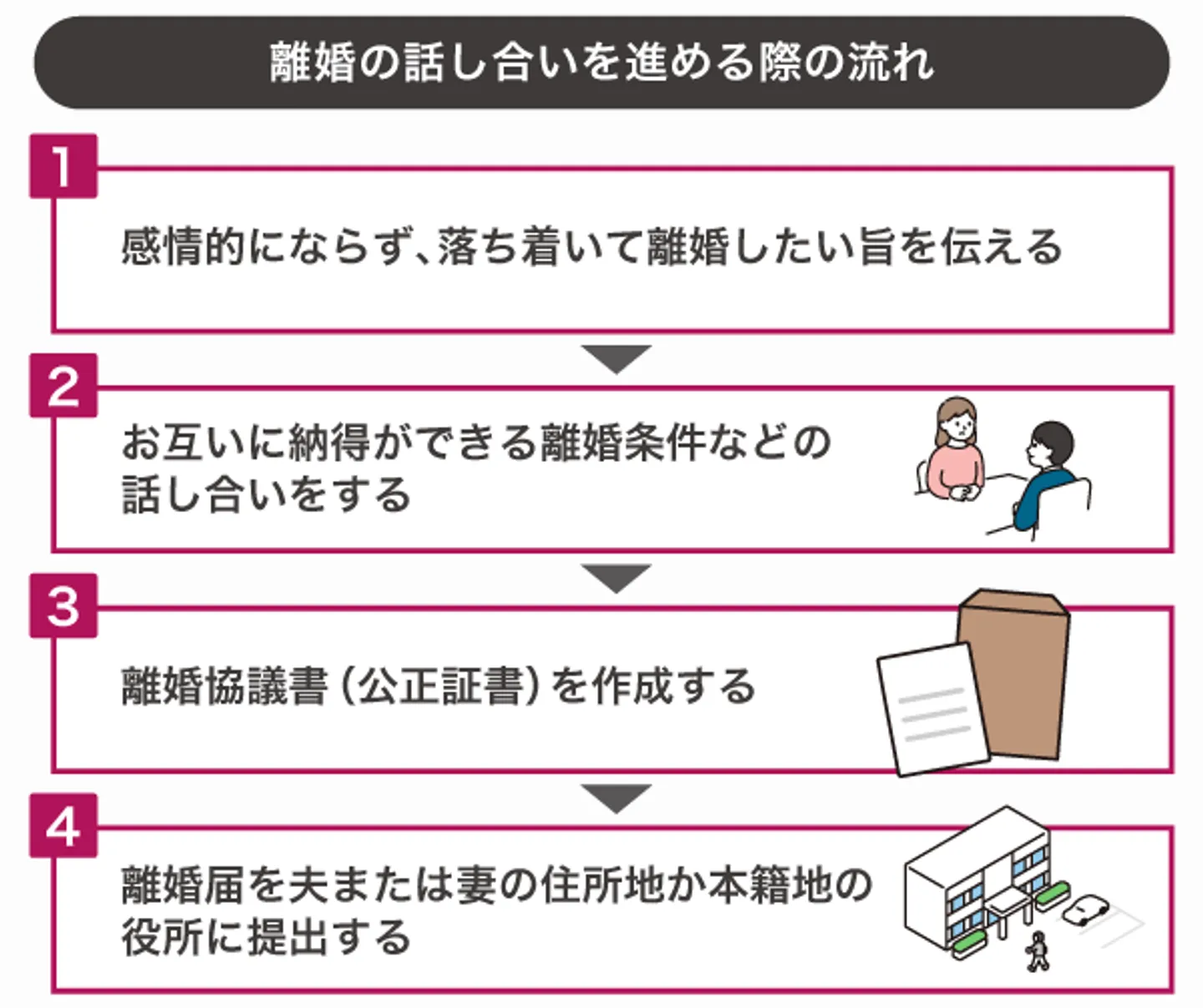 離婚の話し合いを進める際の流れは、以下のとおりです。