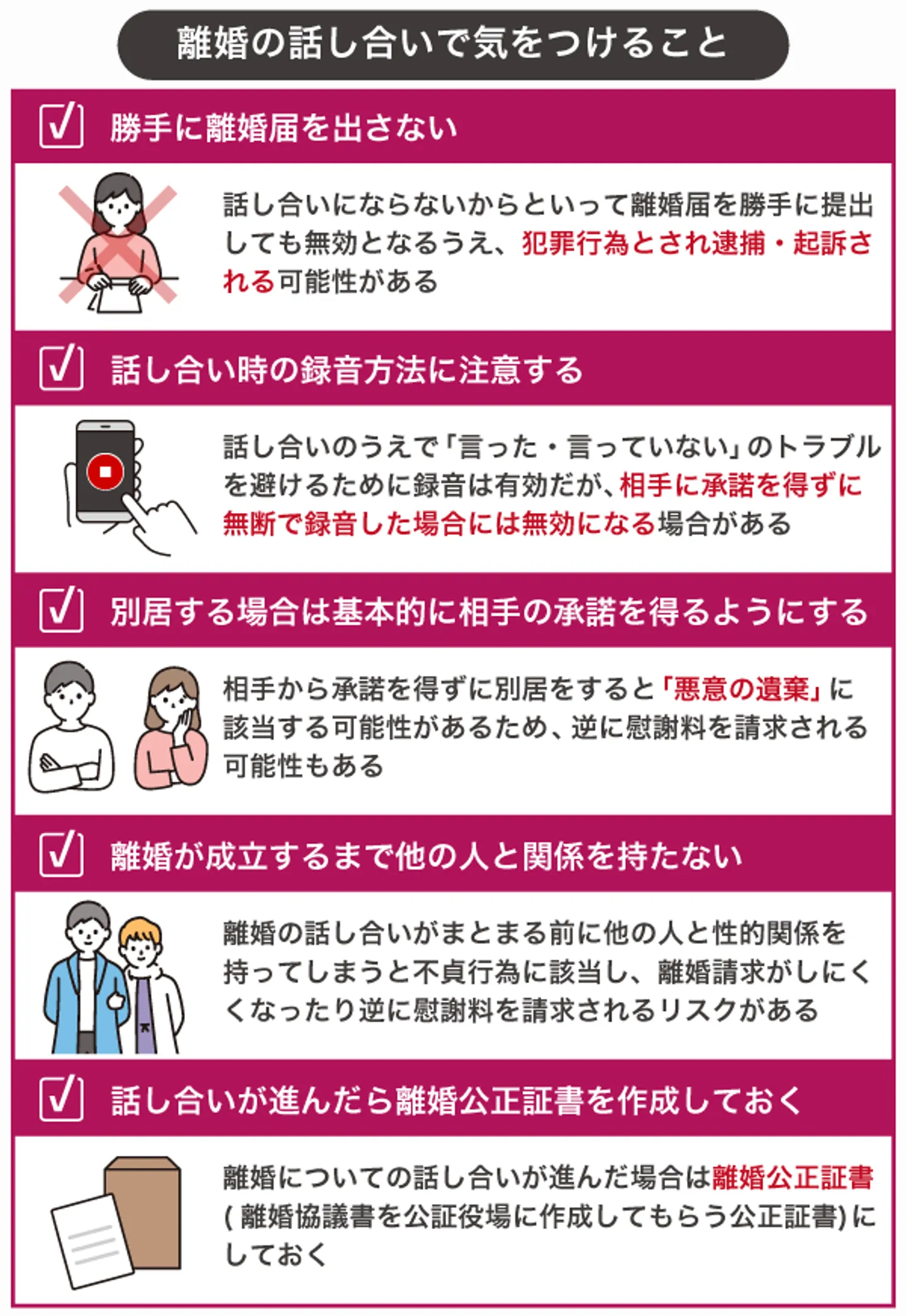 - 住まいや仕事についてなど、離婚後の生活プランを考えておく