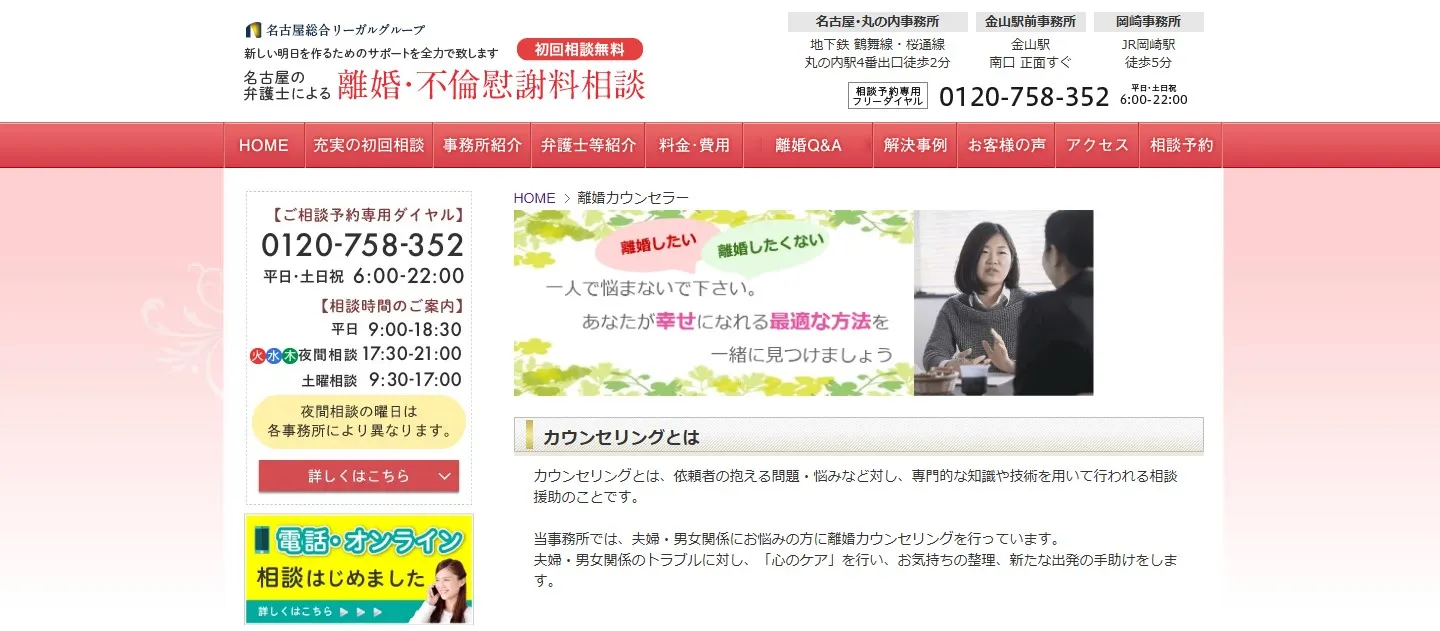 名古屋総合法律事務所は、法律事務所が実施している夫婦問題・離婚カウンセリングであり、離婚や夫婦問題で悩んでいる場合に解決するための最善策を提案してもらえます。