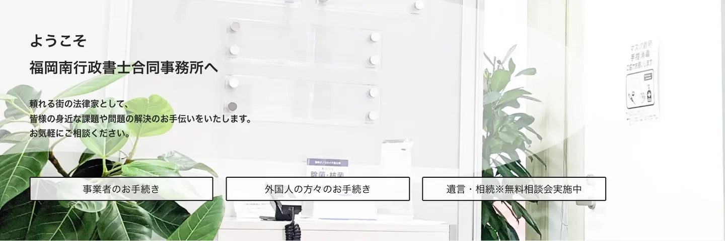 福岡市を中心に県内全域に対応していて、県外からの依頼も受けている事務所です。多くの資格者、業者とネットワークを構築しているため、幅広い分野で専門的なアドバイスができます。
