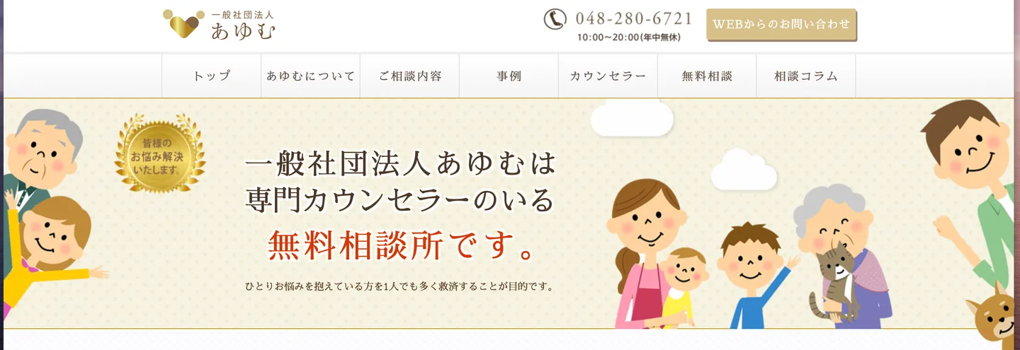 「一般社団法人あゆむ」は、夫婦問題や家族問題の専門カウンセラーが在籍する無料相談所です。夫婦のスキンシップや浮気・不倫問題、離婚問題、男女の問題などを得意としており、経験豊富なカウンセラーが解決へのサポートを行っています。ホームページでは「お子様の問題」「男女の問題」「ご夫婦の問題」「ご家族ご親族の問題」の4項目の相談事例を掲載しており、似たような問題で悩んでいる人は相談することで解決の糸口が見つけられるかもしれません。