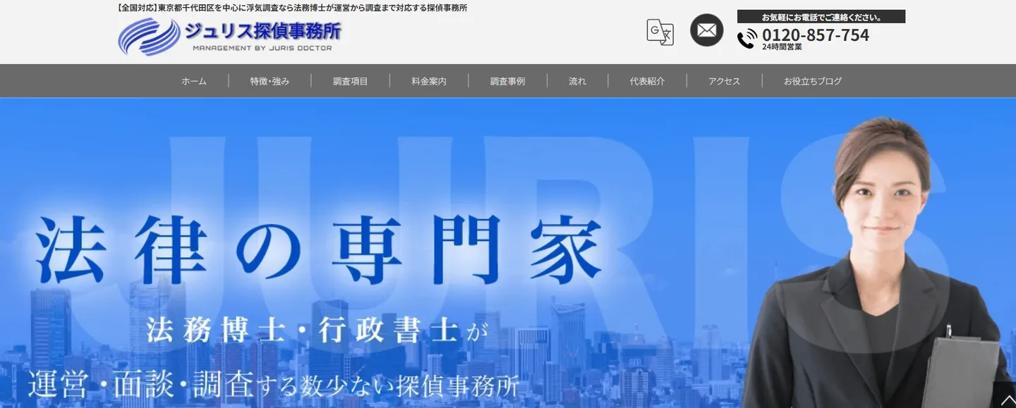 ジュリス探偵事務所は、東京都千代田区を拠点にさまざまな調査サービスを提供している探偵事務所です。法務博士・行政書士の資格を有する代表が運営・面談・調査を行っている数少ない探偵事務所で、法律の専門知識を駆使した高度な調査力を武器としています。