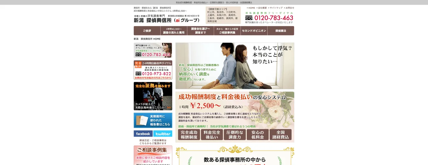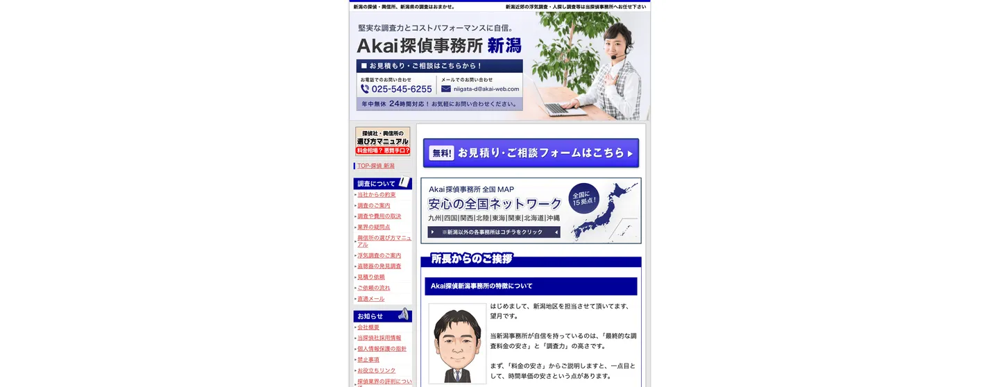 Akai探偵事務所新潟は、調査力の高さと料金の安さに強みがある探偵社です。