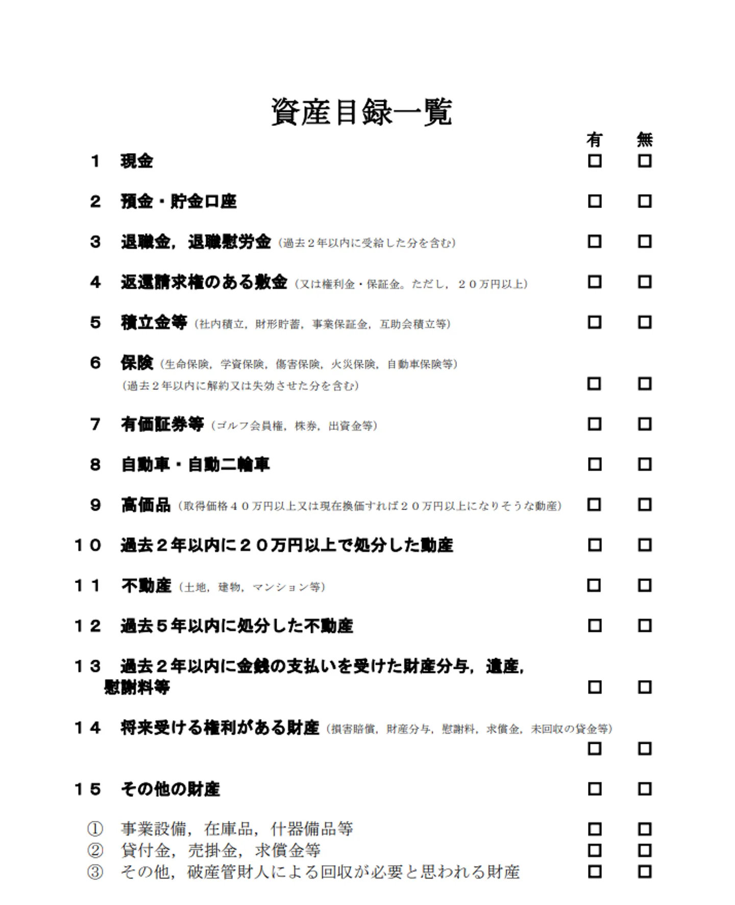 資産目録とはその名の通り、破産者が持っている資産を目録にした書類です。とくに持っている資産がなくても、かならずひとつひとつチェックして記入してください。