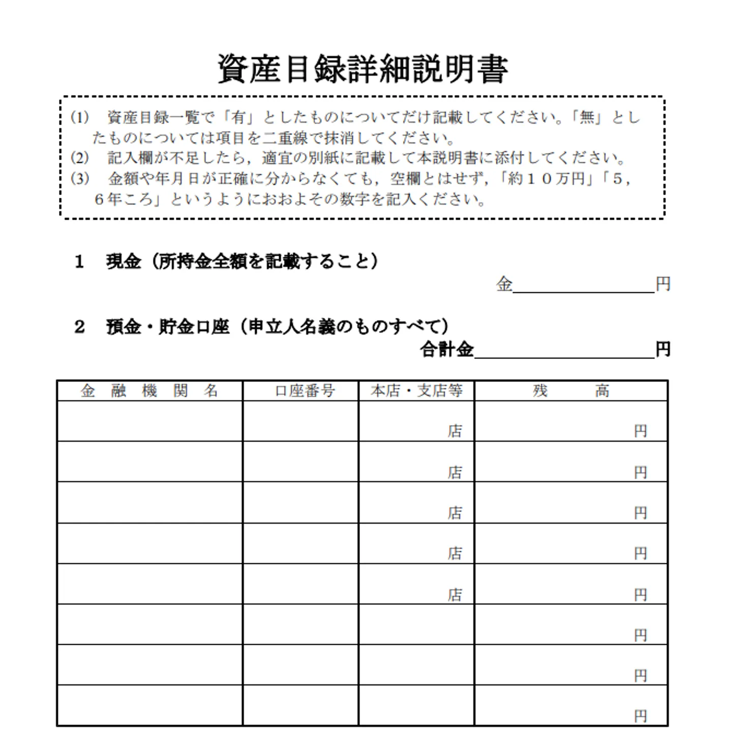 - 資産目録は債務者の資産状況を目録にした書類。一覧と詳細に分かれており、資産状況について詳細に問われる