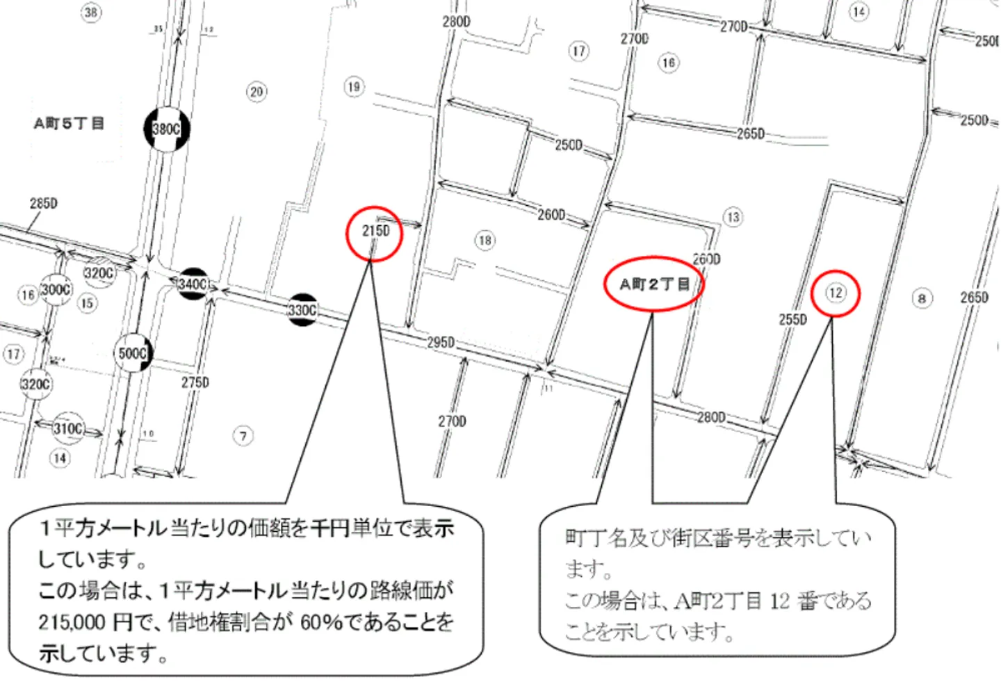 「215」が1㎡当たりの土地の価格を表し、1,000円単位で表示されていますので、この事例地の路線価は、215,000円/㎡となります。