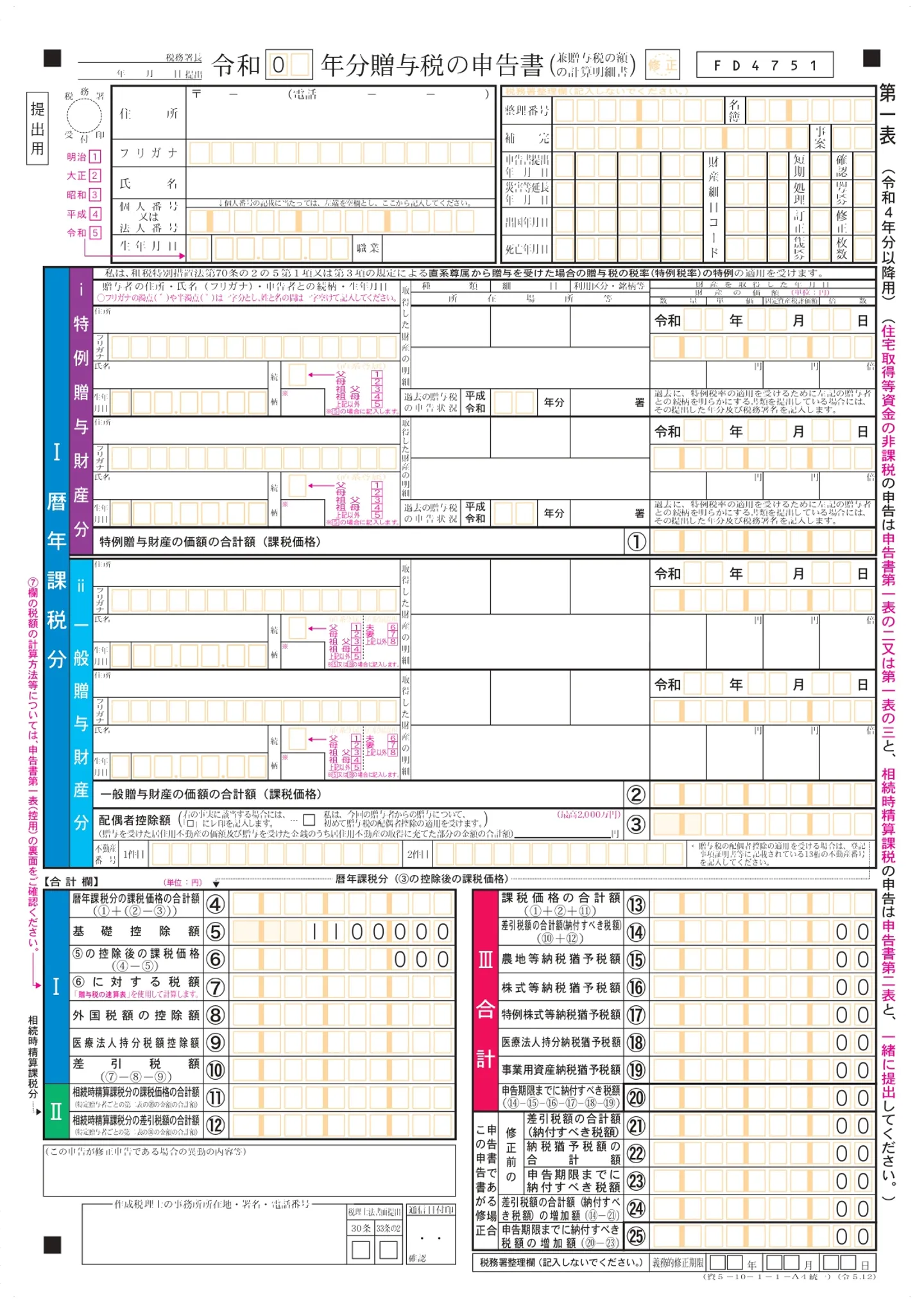 第一表は、贈与税を申告する方は全員提出必須の書類です。